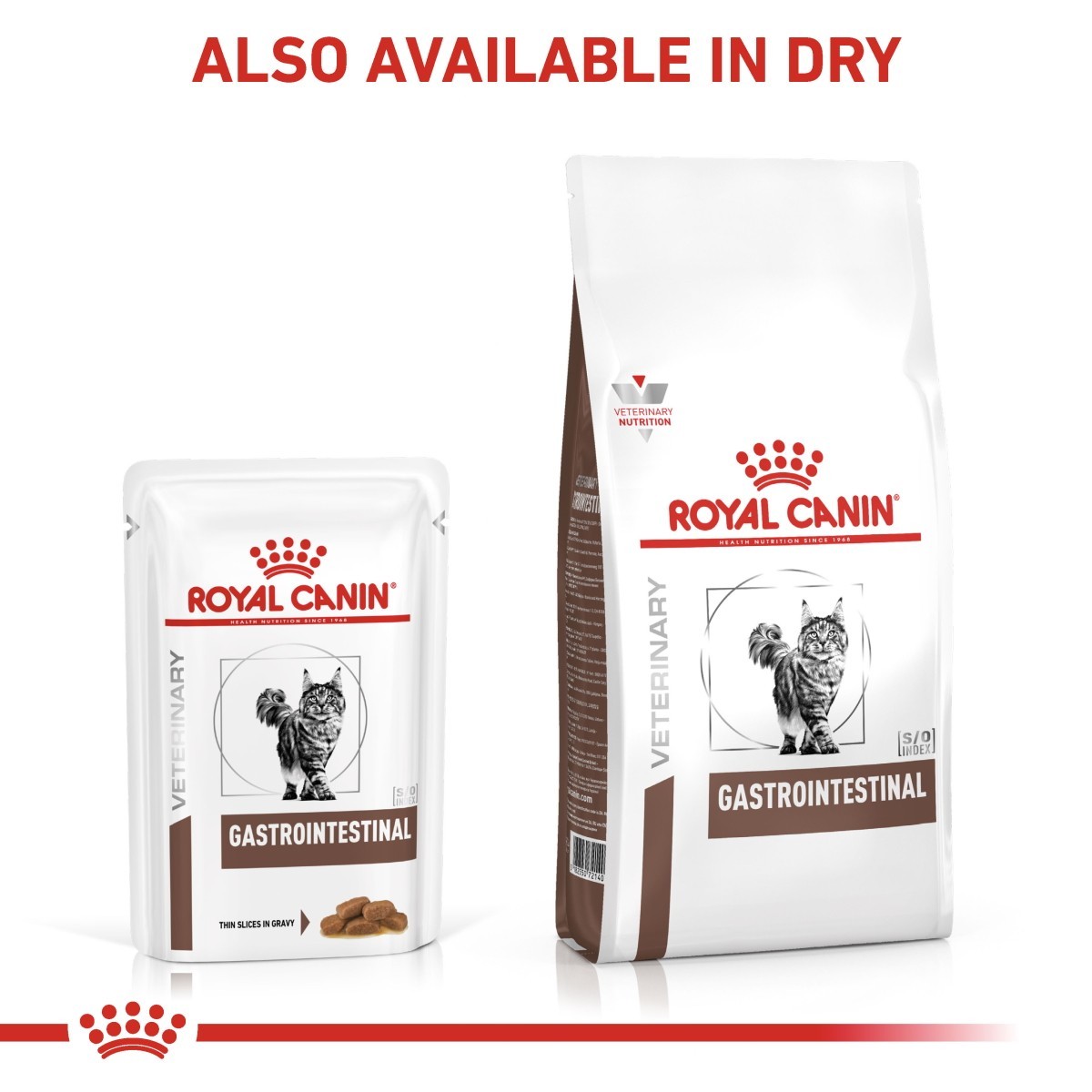 Royal Canin Gastro Intestinal Pouches for Cats is a complete and balanced vet diet for cats with acute and chronic digestive orders, to promote nutritional restoration and convalescence.
