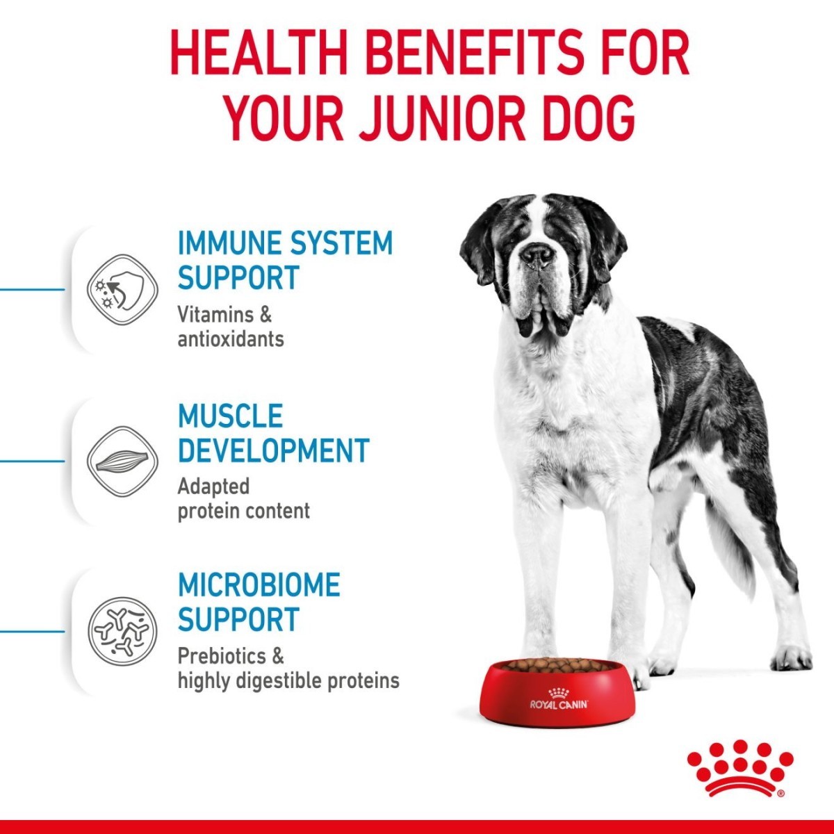 - Muscle Development: An adapted protein and L-carnitine content to help support muscle development in giant breed puppies during the second growth phase from 8 months old.