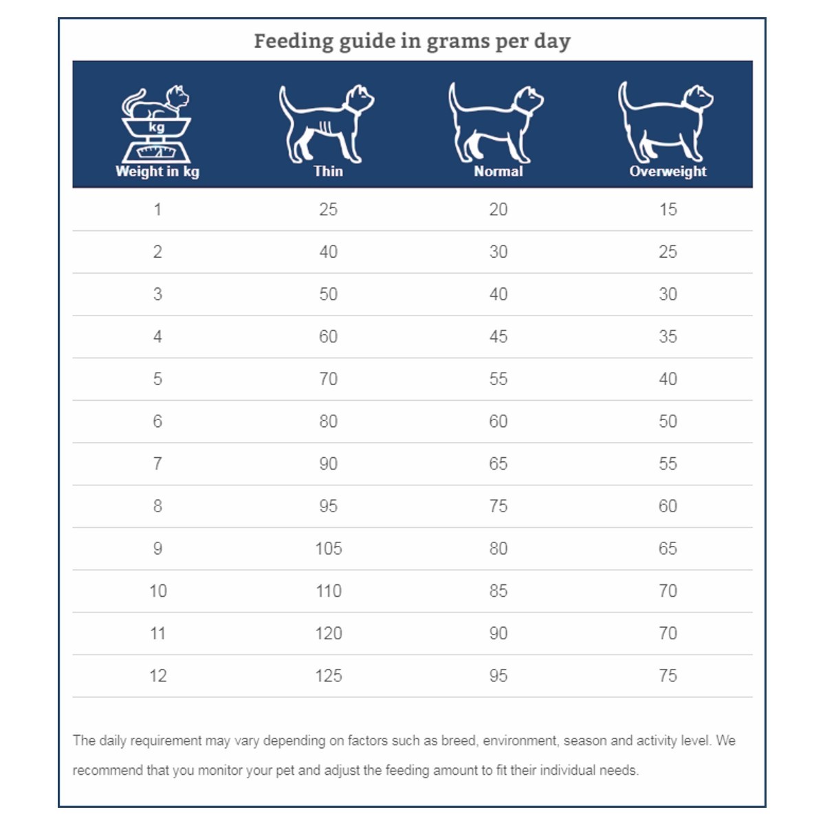 Energy: 1740kJ, Energy: 416kcal, Protein (Crude): 23g, Fat (Crude): 22.5g, Carbohydrate (NFE): 38.2g, Fibre (Crude): 4.0g, Calcium: 0.68g, Phosphorus: 0.39g, Magnesium: 0.07g, Sodium: 0.17g, Potassium: 1.27g, Copper: 0.79mg, Taurine: 260mg, L-Carnitine: 8mg, Omega-3 Fatty Acids: 2.0g, EPA: 0.68g, DHA: 0.87g, Ratio n-3:n-6: 1:2, Water: 6.8g